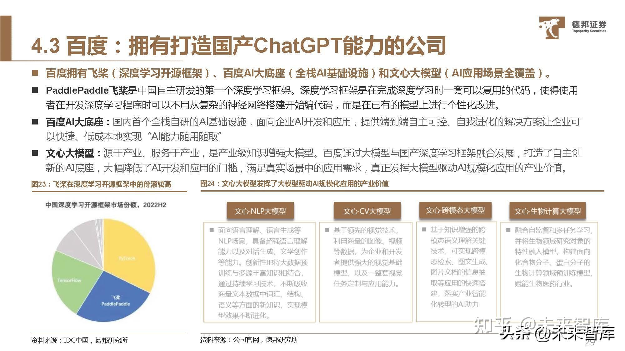 百度拥有飞桨(深度学习开源框架)、百度AI大底座(全栈AI基础设施)和文心大模型(AI应用场景全覆盖)。 PaddlePaddle飞桨是中国自主研发的第一个深度学习框架。深度学习框架是在完成深度学习时一套可以复用的代码,使得使用 者在开发深度学习程序时可以不用从复杂的神经网络搭建开始编代码,而是在已有的模型上进行个性化改进。 百度AI大底座:国內首个全栈自研的Al基础设施,面向企业Al开发和应用,提供端到端自主可控、自我进化的解决方案让企业可 以快捷、低成本地实现“Al能力随用随取” 。文心大模型:源于产业、服务于产业,是产业级知识增强大模型。百度通过大模型与国产深度学习框架融合发展,打造了自主创 新的AI底座,大幅降低了AI开发和应用的门槛,满足真实场景中的应用需求,真正发挥大模型驱动AI规模化应用的产业价值。
