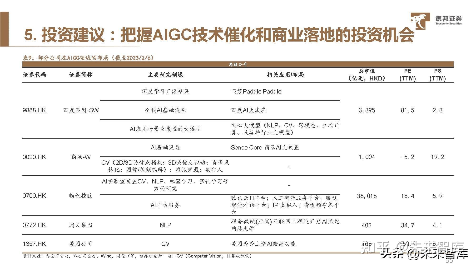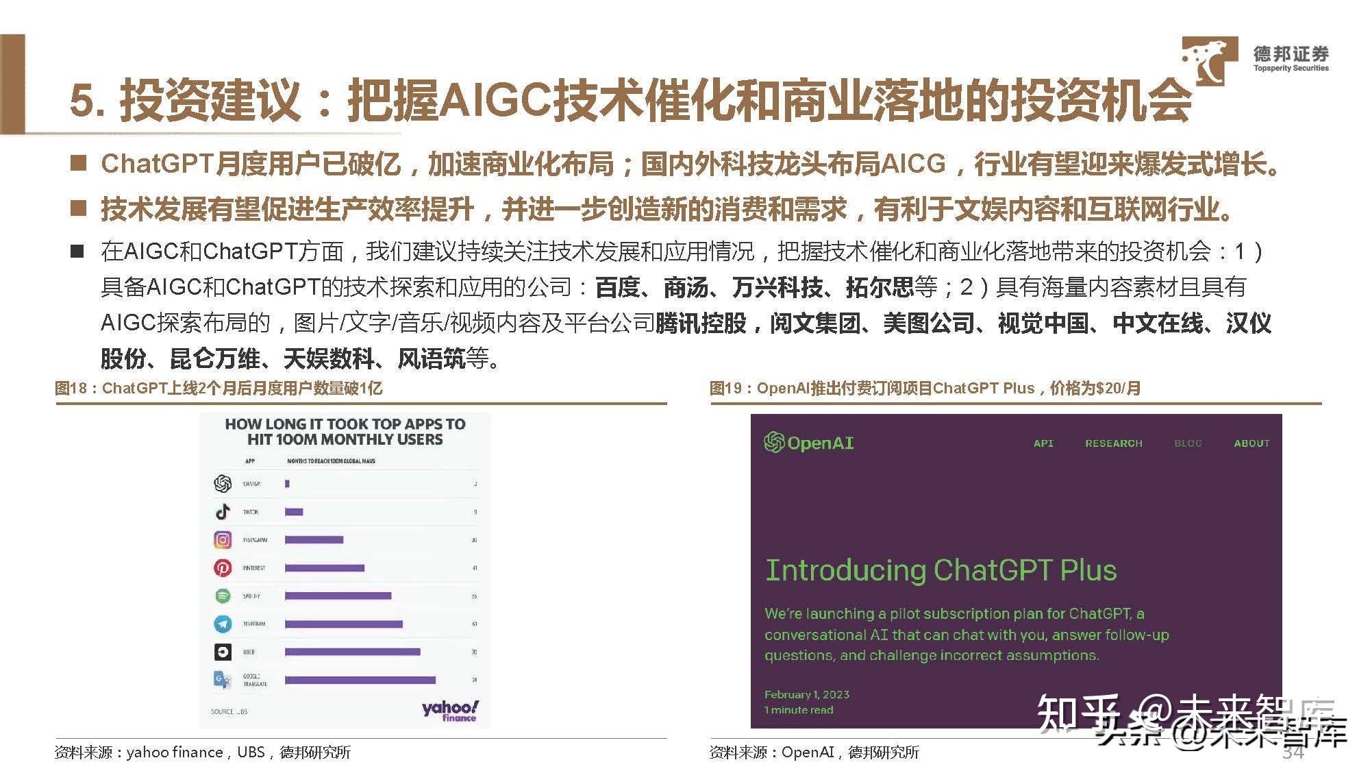 微软作为OpenAI的LP投资者,为公司提供研发底层支撑及应用的大力支持。 资金支持:2019年7月22日,微软投资OpenAI 10亿美元;2023年1月23日,微软宣布与OpenAI建立长期合作伙伴关 系进入第三阶段,通过一项为期多年、数十亿美元的投资来加速AI的突破。 服务支持:1)大规模超级计算—— 微软将增加对开发和部署专用超级计算系统的投资,以加速OpenAI的研究;继续 构建 Azure 领先的 AI 基础结构。2)独家云提供商 – Azure将为研究、产品和API服务中的所有OpenAI工作提供支持。 应用支持:1月17日微软表示,计划将包括ChatGPT、DALL-E等人工智能工具整合进微软旗下的所有产品中,并将其 作为平台供其他企业使用,包括且不限于Bing搜索引擎、Microsoft Office、Azure云服务、Teams聊天程序等。