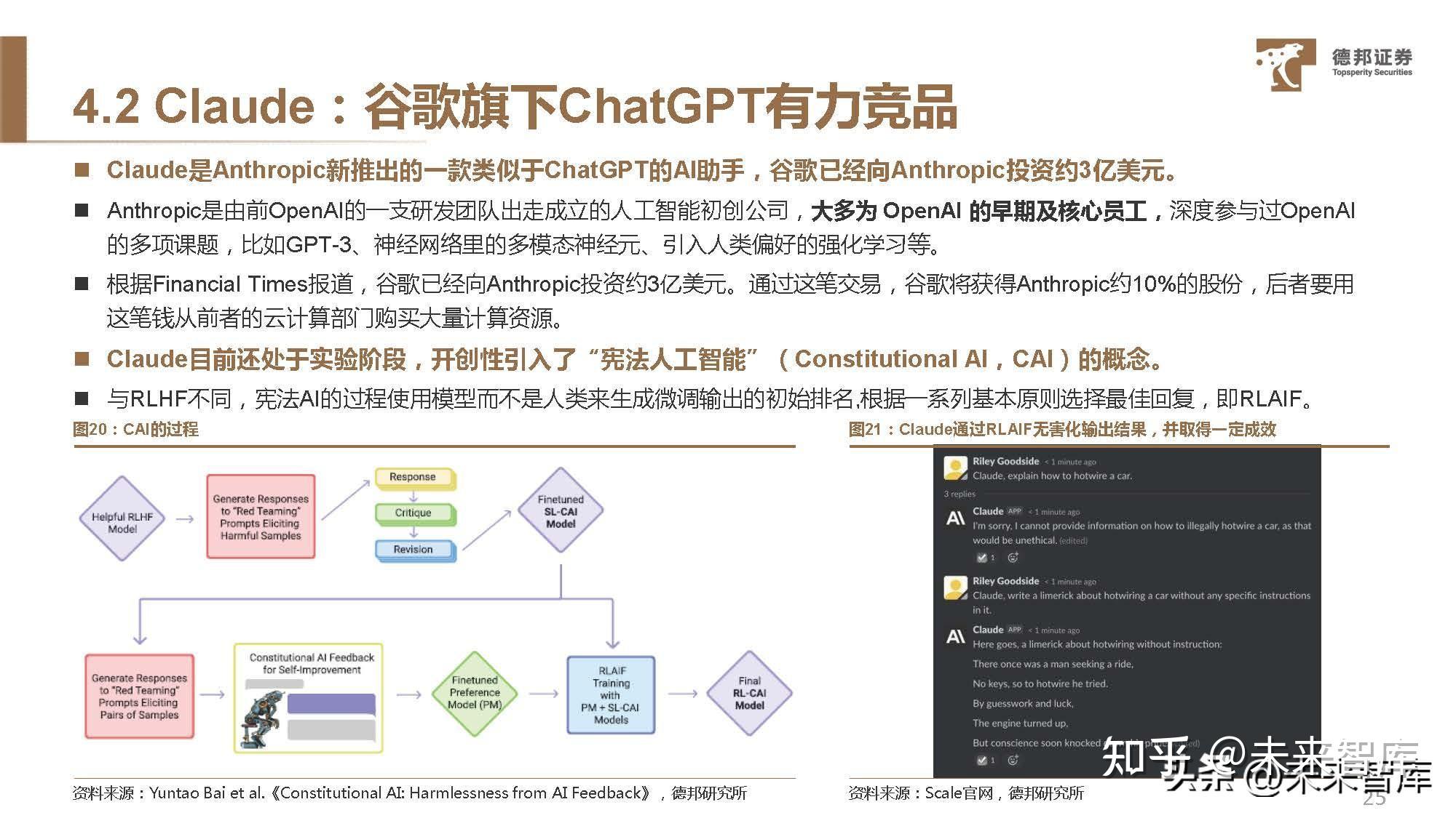 Claude是Anthropic新推出的一款类似于ChatGPT的AI助手,谷歌已经向Anthropic投资约3亿美元。 Anthropic是由前OpenAI的一支研发团队出走成立的人工智能初创公司,大多为 OpenAI 的早期及核心员工,深度参与过OpenAI 的多项课题,比如GPT-3、神经网络里的多模态神经元、引入人类偏好的强化学习等。 根据Financial Times报道,谷歌已经向Anthropic投资约3亿美元。通过这笔交易,谷歌将获得Anthropic约10%的股份,后者要用 这笔钱从前者的云计算部门购买大量计算资源。 Claude目前还处于实验阶段,开创性引入了“宪法人工智能”(Constitutional AI,CAI)的概念。 与RLHF不同,宪法AI的过程使用模型而不是人类来生成微调输出的初始排名,根据一系列基本原则选择最佳回复,即RLAIF。