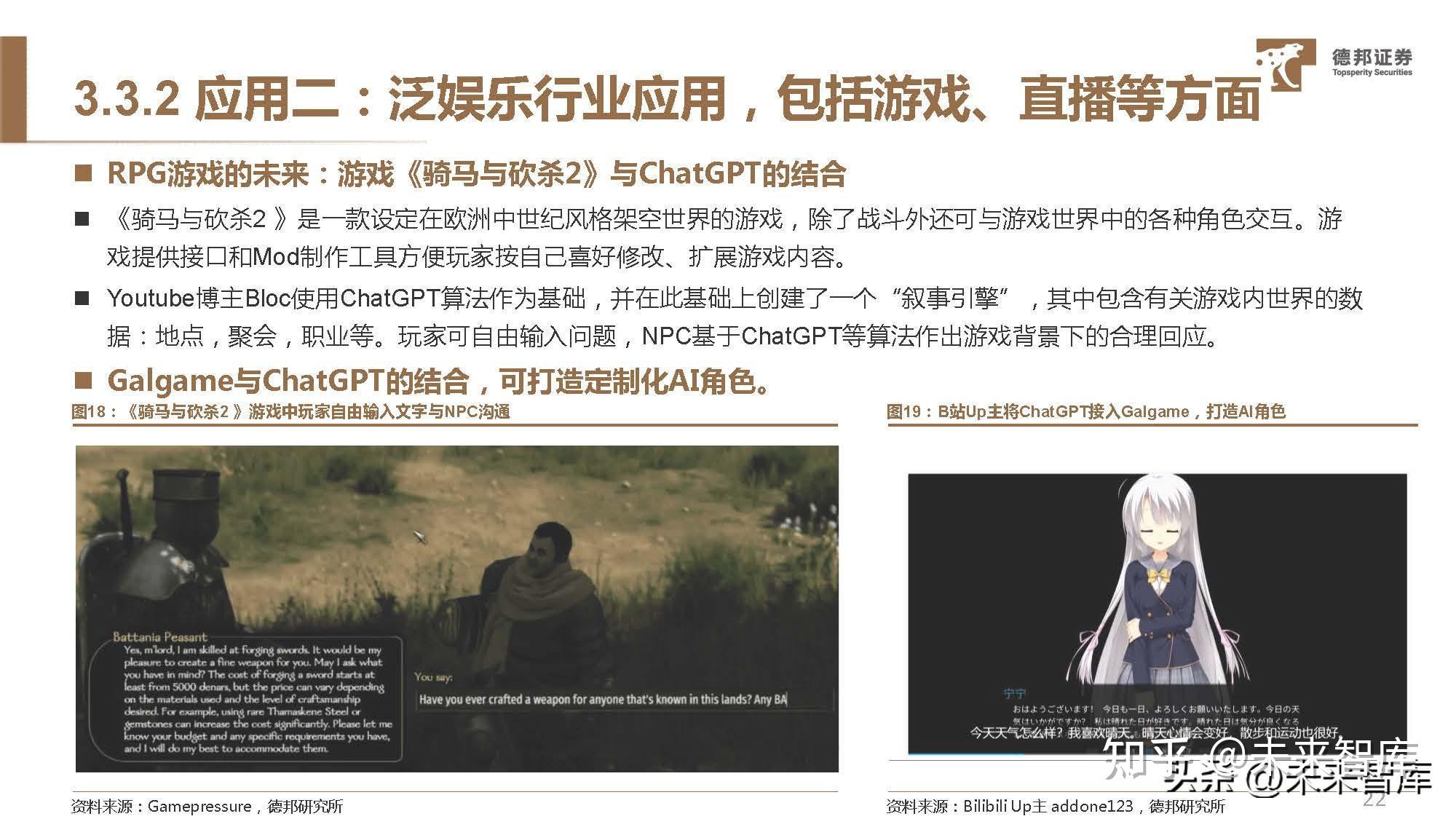 娱乐类:1)AI驱动游戏:AI Dungeon是一款由AI驱动的基于文本的角色扮演游戏,AI会自动生成故事,玩家可以在 其中输入对话,人工智能将以新的事件和对话作出回应,创造独特且不可预测的游戏体验。2)AI聊天伙伴: WhatsApp 上的AI Buddy是由GPT-3.5驱动的软件,可以和用户进行对话,就像发消息给朋友一样。例如,“给我讲个 笑话”、“给我一个博客构思”等。