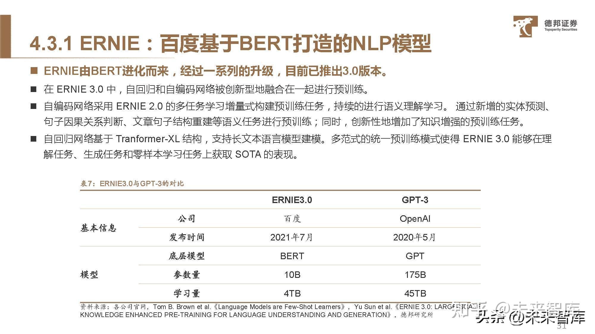 ERNIE由BERT进化而来,经过一系列的升级,目前已推出3.0版本。 在 ERNIE 3.0 中,自回归和自编码网络被创新型地融合在一起进行预训练。 自编码网络采用 ERNIE 2.0 的多任务学习增量式构建预训练任务,持续的进行语义理解学习。 通过新增的实体预测、 句子因果关系判断、文章句子结构重建等语义任务进行预训练;同时,创新性地增加了知识增强的预训练任务。 自回归网络基于 Tranformer-XL 结构,支持长文本语言模型建模。多范式的统一预训练模式使得 ERNIE 3.0 能够在理 解任务、生成任务和零样本学习任务上获取 SOTA 的表现。