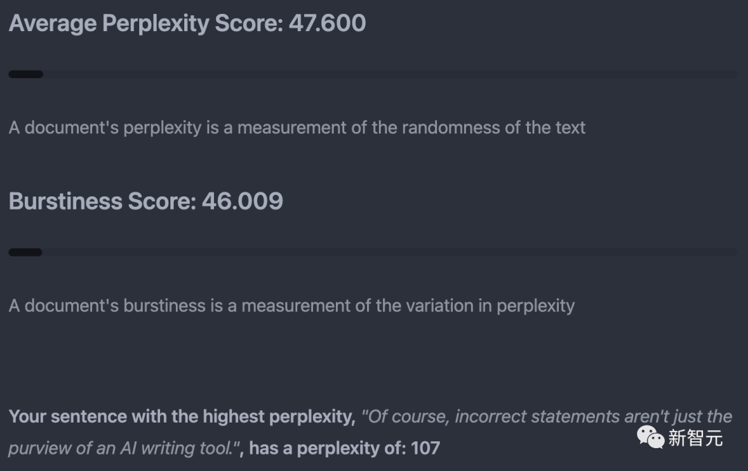 原理上,GPTZero主要靠「困惑度」(文本的随机性)和「突发性」(困惑度的变化)作为指标进行判断。