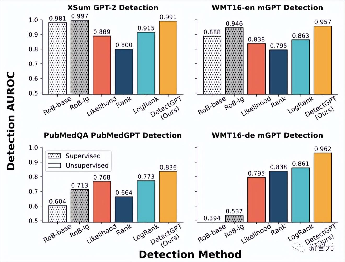 此外,经过真实和生成文本的大型数据集训练的有监督检测模型,在分布式文本上的表现与DetectGPT一样,甚至更好。(上)