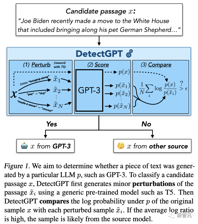 首先需要DetectGPT使用一个通用的预训练模型(如T5)对该段落产生轻微的扰动。然后再让DetectGPT比较原始样本与每个扰动样本的对数概率。