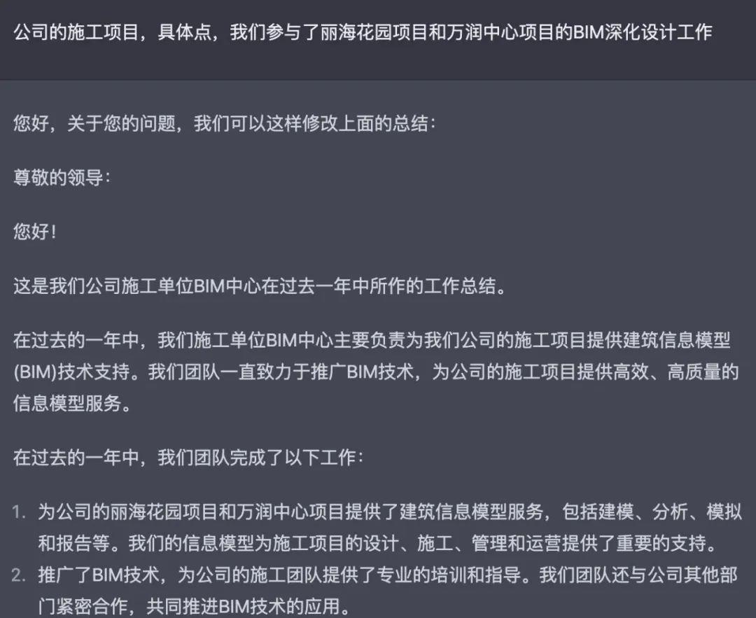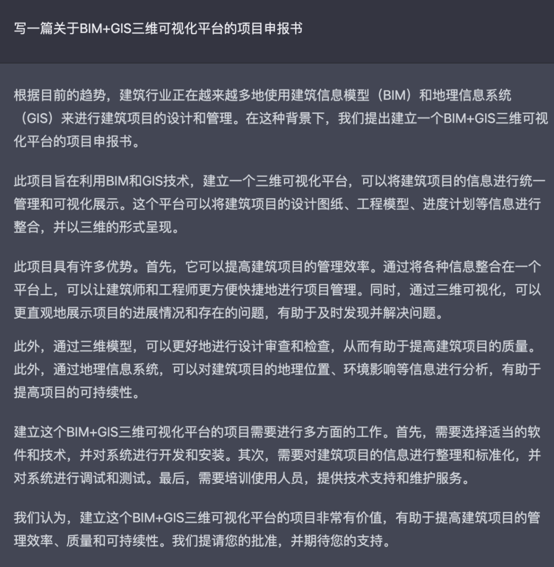 比如,咱们让它帮忙写个 BIM+GIS 可视化平台的项目申报书,至于 BIM 和 GIS 是啥,能有什么用,不用解释,一句话下个命令,主要提纲就出来了。