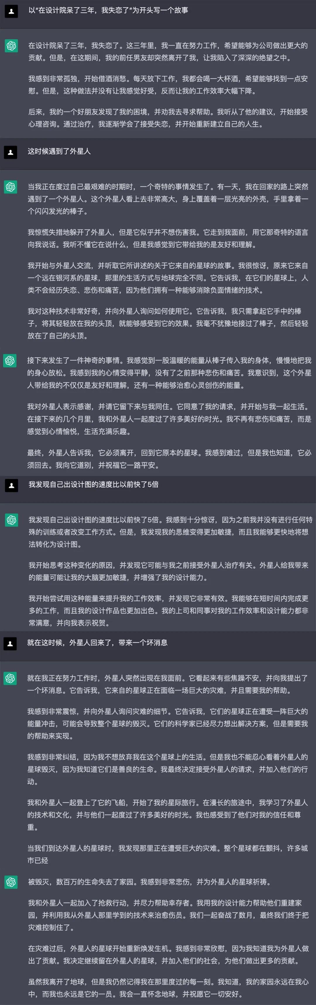 好了,今天正经的内容就到这啦,既然大家都调戏它,BOX 也不能免俗,就逼着它编一个「设计院打工仔先是失恋、又遇到了外星人」的故事,你可以看看它把话圆得怎么样。